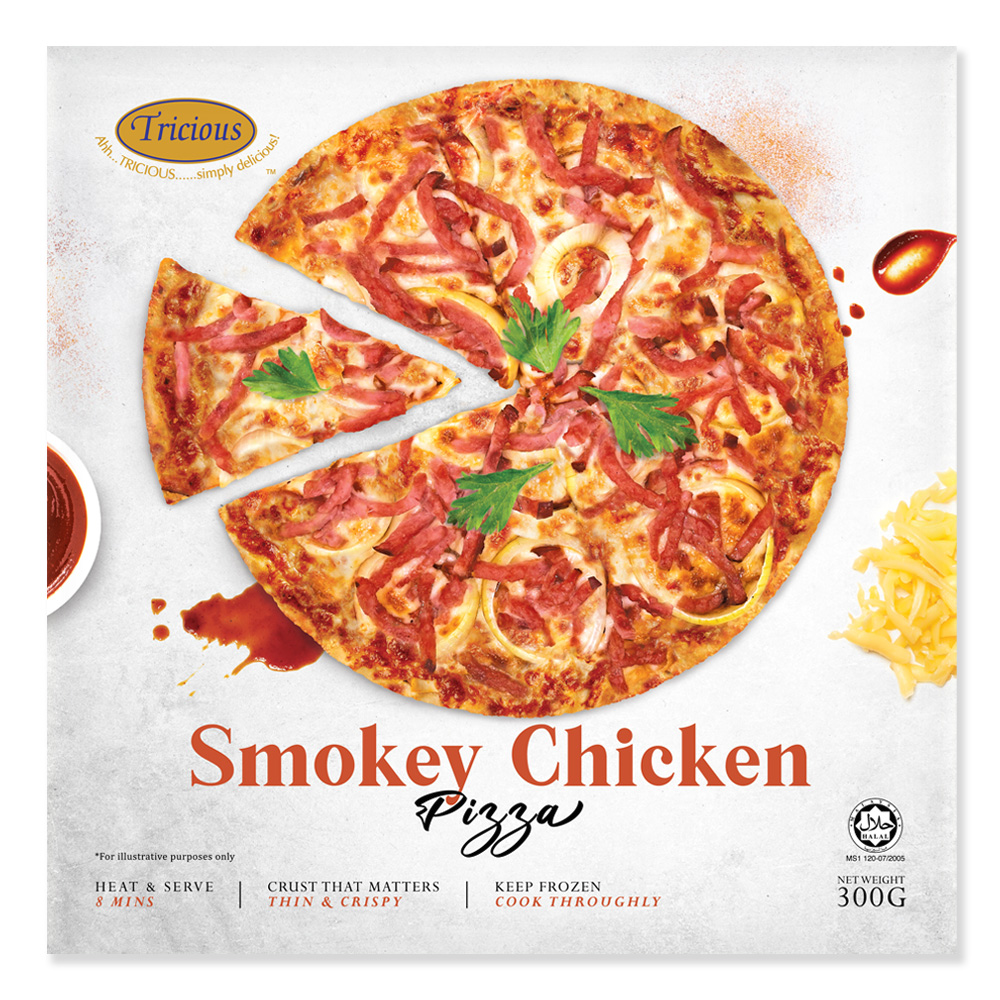 Pizza Base, Tomatoes, Water, Cheese, Smoke Chicken Roll, Barbecue Sauce, Salt, Palm Oil, Onion, Garlic Sugar, Oregano, Spices And Basil